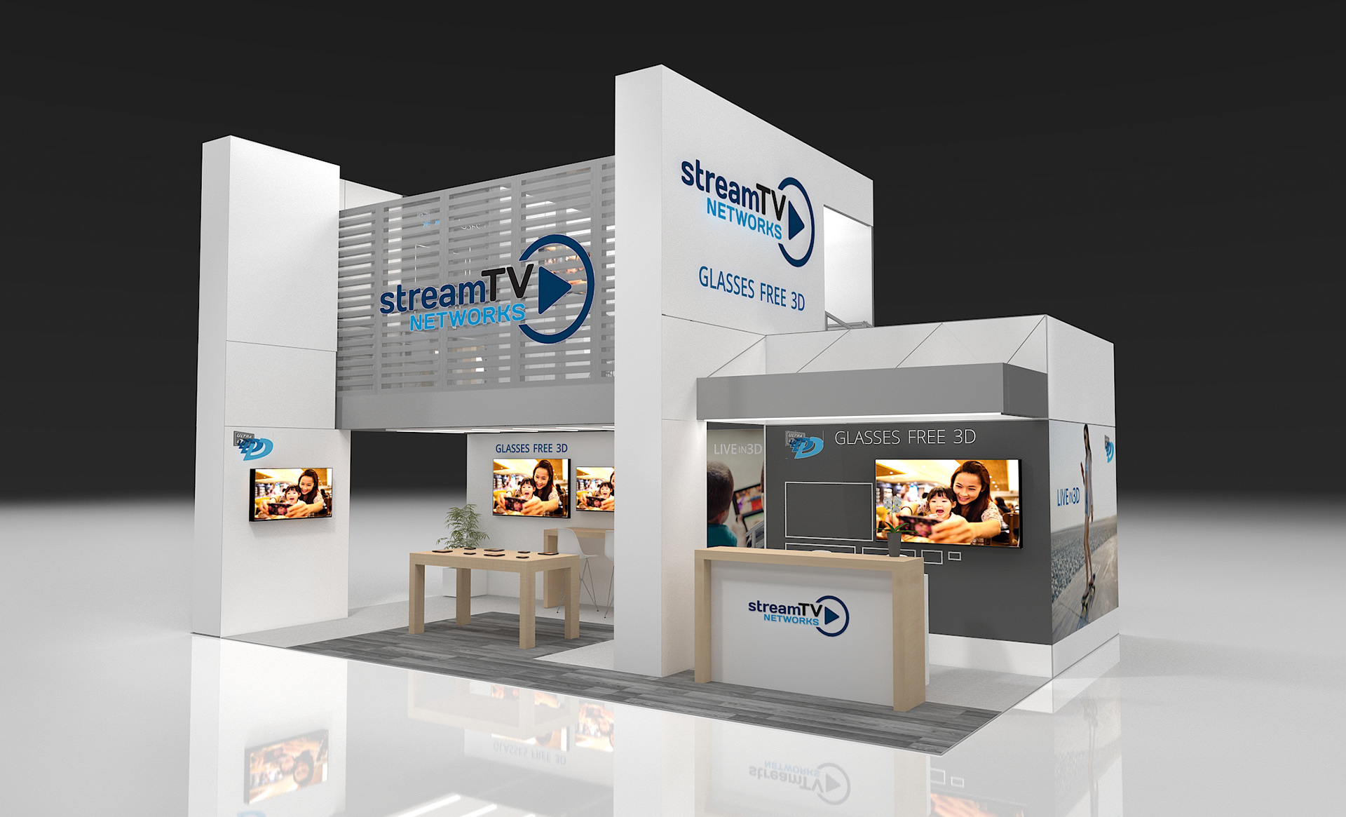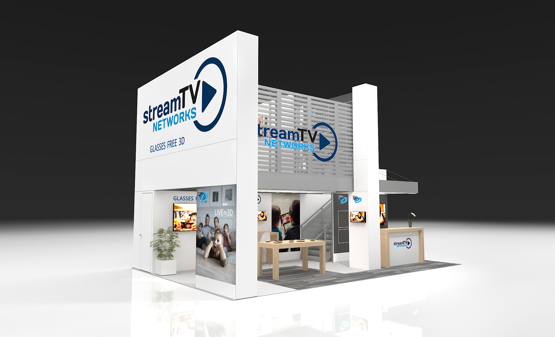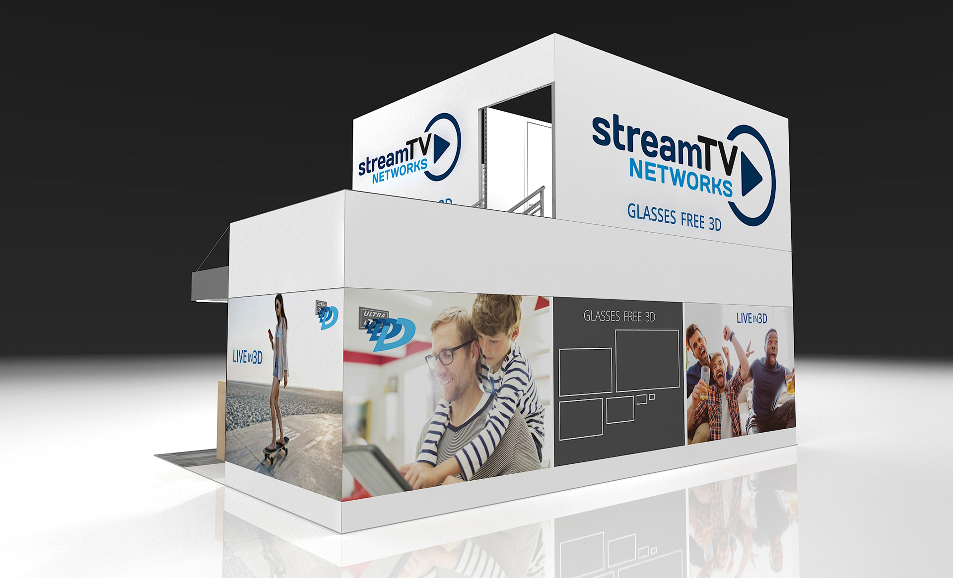Design concept for a glasses free 3D TV company's 20' x 30' exhibit. A double deck and single floor concepts were developed and lifestyle images and branding were developed to showcase the product.