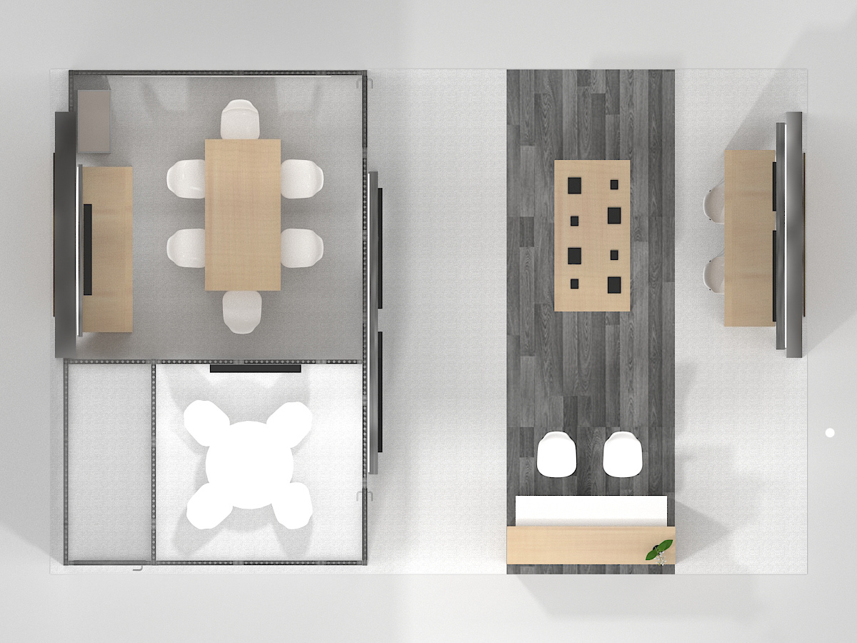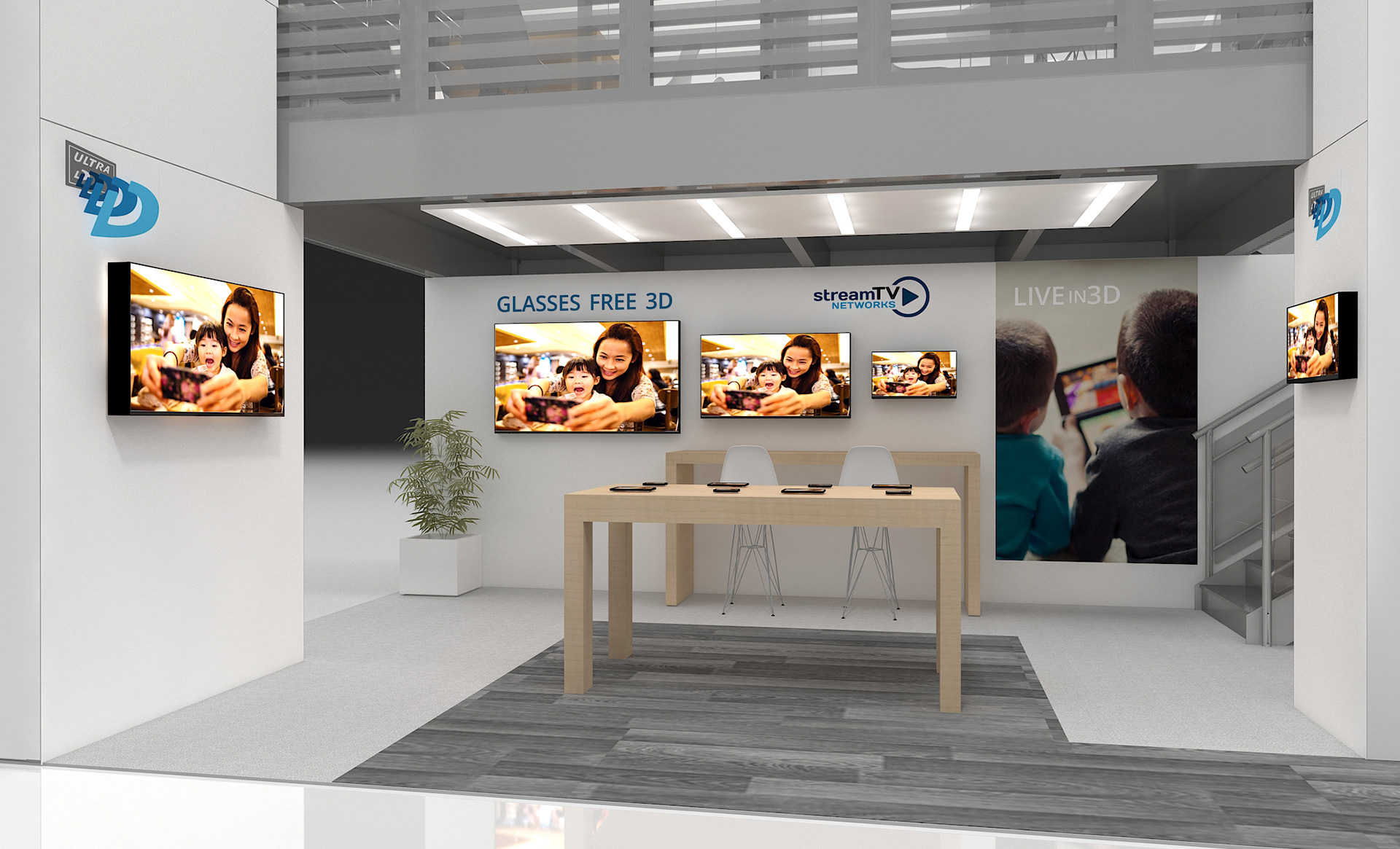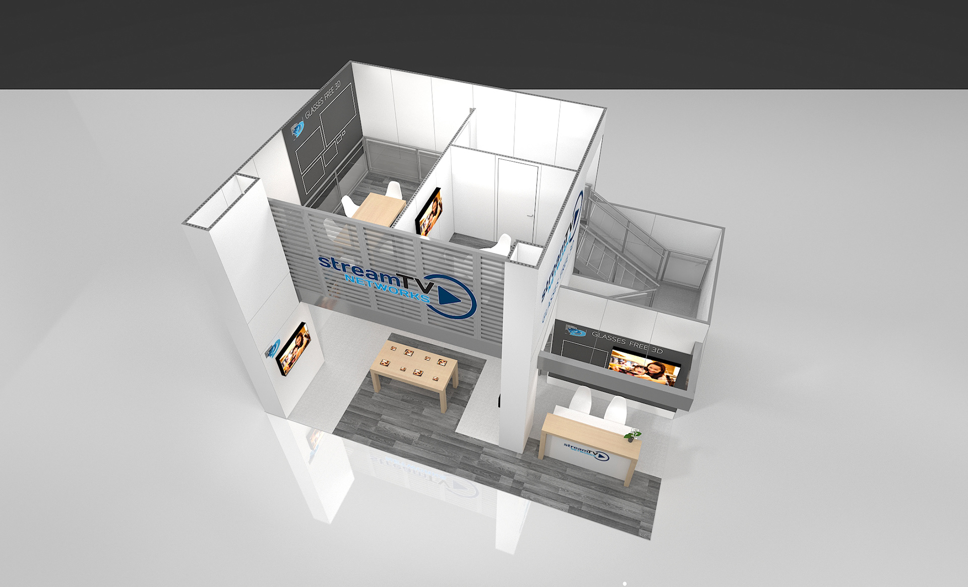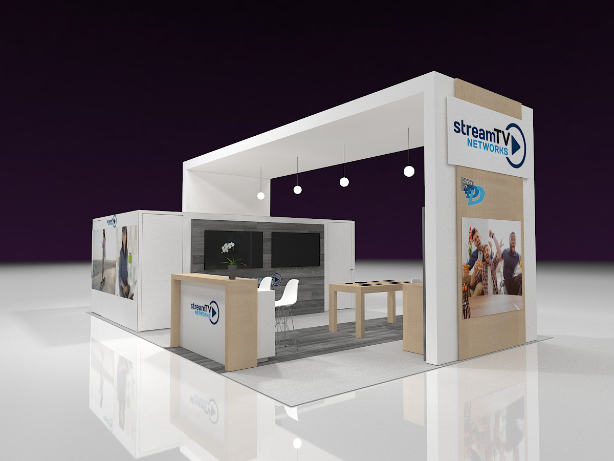 Design concept for a glasses free 3D TV company's 20' x 30' exhibit. A double deck and single floor concepts were developed and lifestyle images and branding were developed to showcase the product.